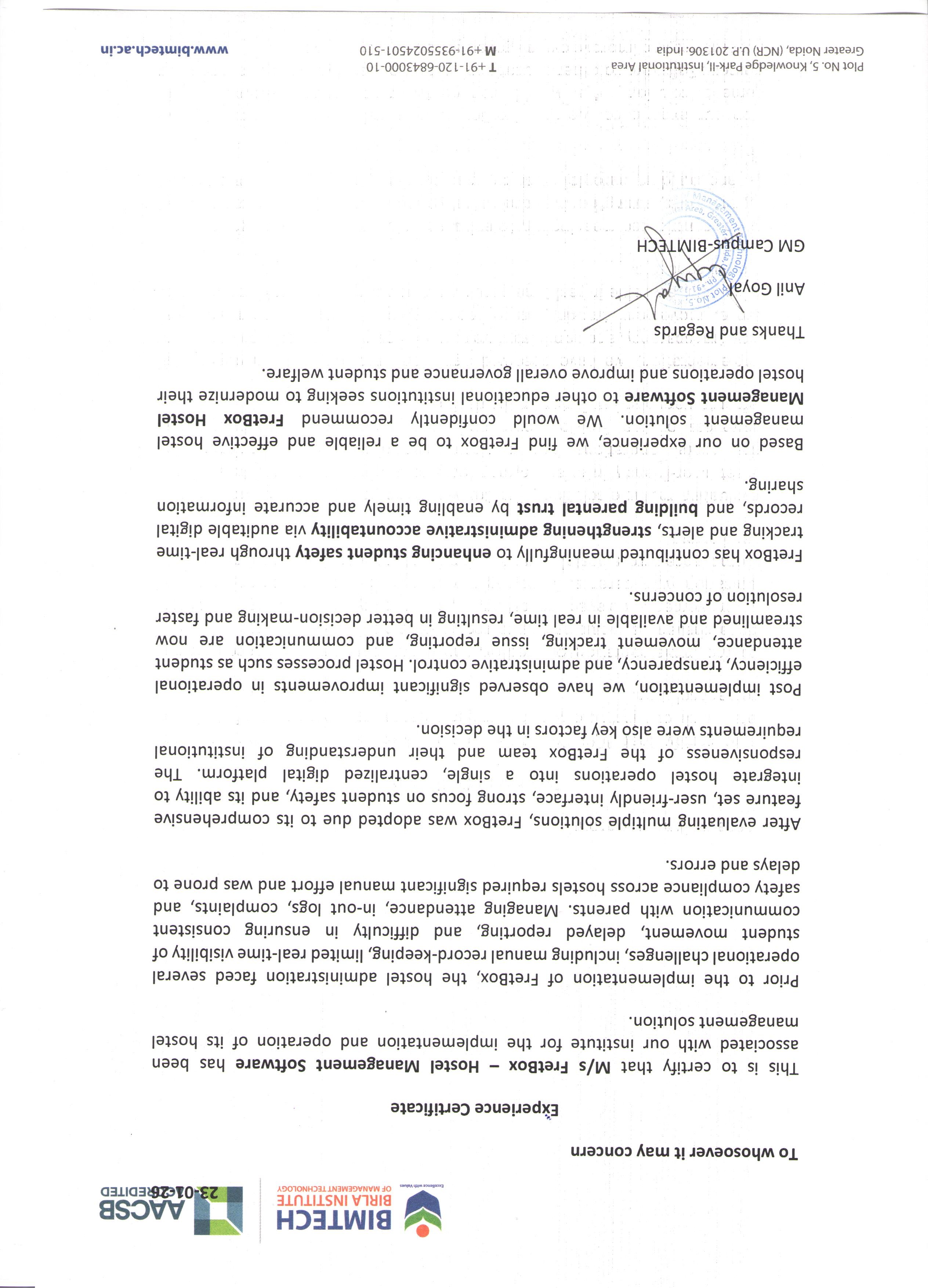 Birla Global University issued a formal experience letter recognizing FretBox's contribution to hostel digitization, safety improvement, and compliance excellence across its campus.